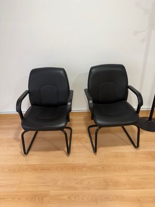 Conjunto de dos sillas de oficina con un diseño moderno y cómodo. - Asientos y respaldos acolchados. - Brazos curvos. - Base metálica. - En las imágenes aparecen 2 sillas pero tengo 5 en total. - Se pueden ver sin compromiso en el centro de Bilbao, cerca de la plaza moyua. - 9€/ unidad.