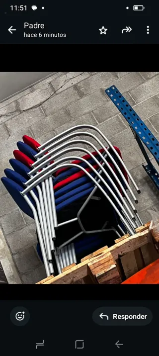 Conjunto de sillas apilables con estructura metálica y asientos de tela. - Asientos en color azul y rojo. - Estructura de metal. - Tapicería de tela. En pack de 3 salen a 15 € cada una
