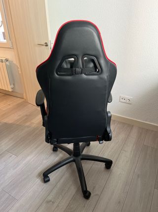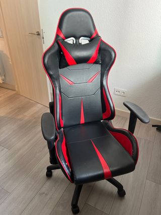 Vendo silla de oficina tipo gaming en color negro, con diseño ergonómico y respaldo alto. Cuenta con reposabrazos acolchados, respaldo envolvente con huecos tipo racing y base con ruedas para fácil desplazamiento. La silla es regulable en altura y gira 360°. Es cómoda tanto para trabajar como para estudiar o jugar durante varias horas. Estado: usada, en buen funcionamiento. Presenta desgaste visible en el borde delantero del asiento (ver fotos), típico del uso, pero no afecta a la comodidad ni a la estructura. El respaldo y el mecanismo están en buen estado. Características: • Color: negro • Material: polipiel • Respaldo alto