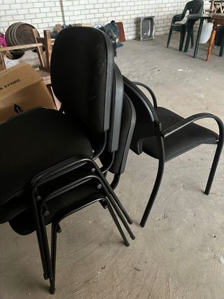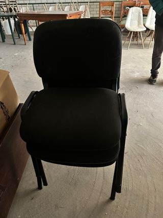 Conjunto de cuatro sillas de oficina en color negro. Son apilables para un fácil almacenamiento. 20€ sueltas. - Estructura metálica. - Asiento y respaldo tapizados en tela.