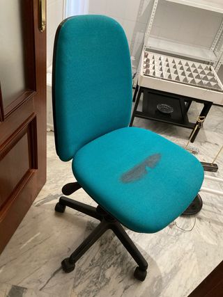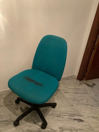 Silla de escritorio giratoria, ideal para oficina o estudio. Tiene un diseño sencillo y funcional. - Estructura resistente. - Tiene un pequeño defecto indicado en la última foto, por el l uso. - Cinco ruedas para facilitar el movimiento.