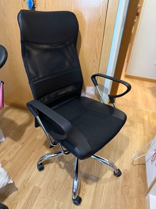 Silla de oficina con un diseño moderno y confortable. - Respaldo alto con soporte lumbar. - Reposabrazos acolchados. - Base giratoria con ruedas. Se recoge en Valdemoro