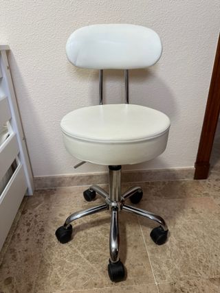 Taburete giratorio con respaldo y base de cinco patas con ruedas. - Altura regulable. - Asiento y respaldo acolchados. - Base cromada. - Medidas en última fotografía