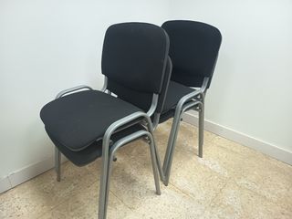 Conjunto de dos sillas de oficina apilables, perfectas para optimizar el espacio. - Estructura metálica robusta. - Asiento y respaldo tapizados en tela. Precio unitario 18€ Precio conjunto 4 sillas 65€