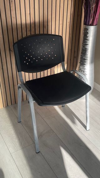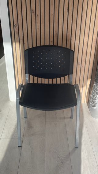 Silla de oficina con un diseño moderno y funcional. - Asiento y respaldo de plástico. - Patas y estructura de metal. Precio 10 euros por silla.