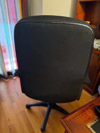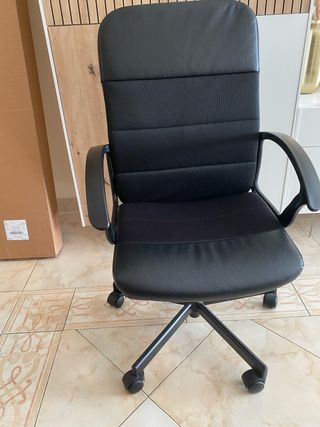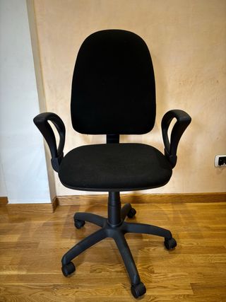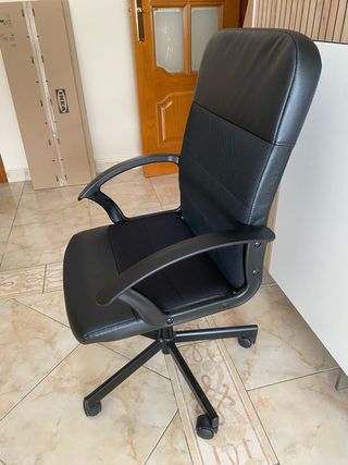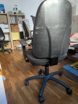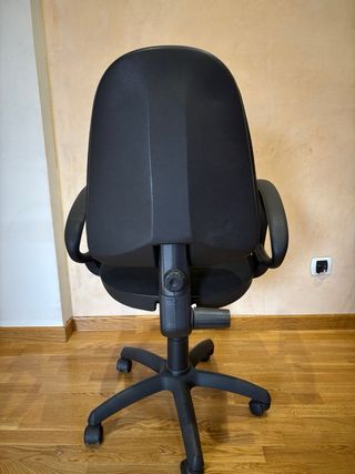 Silla de oficina con diseño ergonómico y reposabrazos ajustables. - Altura e inclinación regulables para mayor comodidad. - Base giratoria con ruedas para fácil movilidad. - El plástico trasero está un poco raspado, pero es la silla más pesada que tengo, con lo cual su construcción es muy muy sólida.