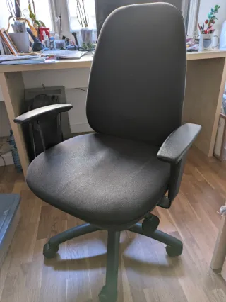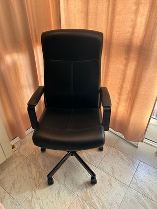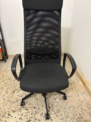 Silla de oficina ergonómica de la marca Ikea. - Respaldo alto con malla transpirable. - Asiento acolchado. - Reposabrazos. - Base con ruedas. En muy buen estado con poco uso. Precio en tienda nueva 159€