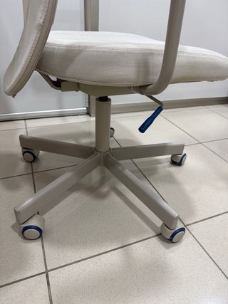 Silla de oficina de Ikea en color beige. Un asiento cómodo y funcional para tu espacio de trabajo. - Respaldo de malla transpirable. - Base con ruedas para fácil movilidad. - Reposabrazos integrados.