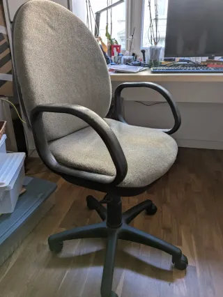 Silla de oficina con un diseño moderno y funcional, ideal para tu espacio de trabajo. Silla bastante usada. Contiene algunos defectos, pero esta bien conservada. - Asiento y respaldo ergonómicos. - Base giratoria con ruedas para fácil movilidad. - Apoyabrazos cómodos.
