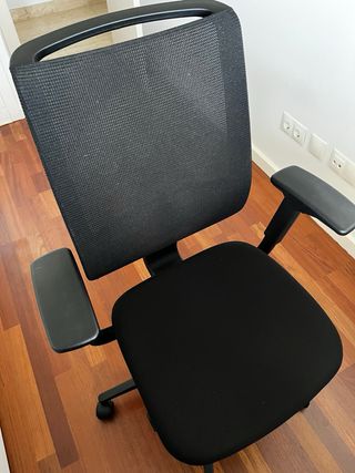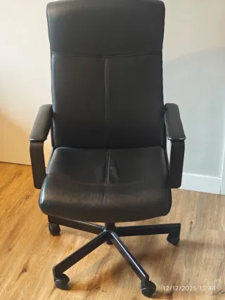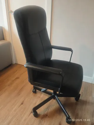 Silla de escritorio de Ikea, color negro. Está en buen estado, aunque muestra señales normales de uso. - Cómoda y práctica para trabajar. - Estructura de plástico y cuero sintético.