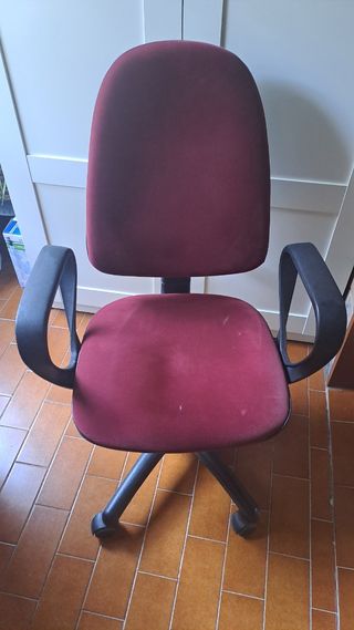Se vende silla de oficina giratoria. Es de color rojo burdeos y está en buen estado, aunque presenta algunas señales de uso en el asiento (ver última foto). Funciona perfectamente. Otras características: - Estable y cómoda - Giratoria - Con reposabrazos - 5 Ruedas - Respaldo ajustable en altura e inclinación, y además permite también ampliar o reducir la distancia a los riñones.