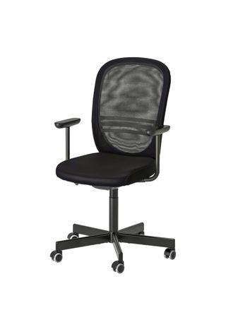 Silla de oficina IKEA FLINTAN en color negro. Su diseño ergonómico la hace cómoda para largas jornadas de trabajo. - Respaldo de malla transpirable. - Asiento acolchado. - Base con ruedas para fácil movilidad.