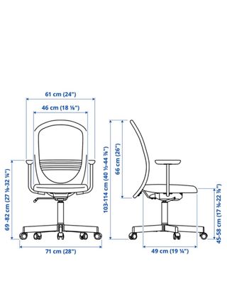 Silla de oficina IKEA en color negro, con ruedas para facilitar su movilidad. - Base de plástico resistente. - Tapicería de tela y polipiel - Cilindro que sube y baja la silla nuevo - Altura asiento: min 55 cm y ma 67 cm - Ruedas nuevas