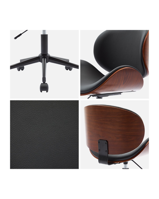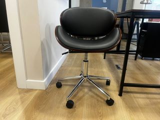 Silla de oficina con un diseño moderno y cómodo. - Asiento y respaldo acolchados. - Base giratoria con ruedas. - Estructura con detalles en madera.