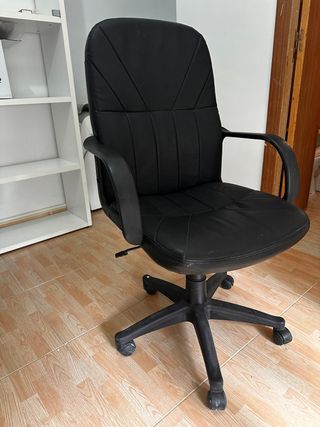 Se la doy al primero que pueda venir a recogerla, no reservo. Recogida en el plantío, aravaca. Silla de oficina giratoria en color negro. Cuenta con una base de cinco patas y ruedas para facilitar su movilidad. - Respaldo ergonómico. - Asiento acolchado. - Altura ajustable.