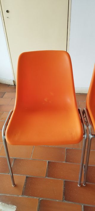 Pareja de sillas de diseño retro. Son de color naranja y tienen una estructura de metal y plástico. Se encuentran en buen estado, con algunas señales normales de uso. - Ideales para darle un toque vintage a tu hogar u oficina. - Cómodas y ligeras. - Perfectas para cualquier espacio. Posibilidad de engancharla una a la otra. Si sólo te interesa una se puede hablar, una sale más cara que comprando el par. Las dos 40€ y una unidad 25€