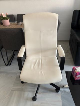 Silla de oficina con un diseño moderno y funcional. - Asiento y respaldo tapizados en piel sintética. - Base y brazos de metal. - Ruedas para fácil movilidad. Silla giratoria de cuero blanca con algún desperfecto en el cuero . Para oficina o escritorio . Precio 35€