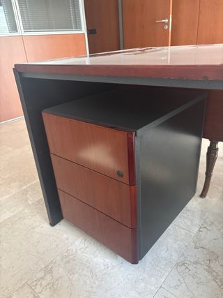 Mesa de escritorio con diseño esquinero, combinando materiales y colores. - Superficie principal en tono marrón oscuro. - Base en forma curva de color negro. - Superficie adicional en la esquina. - Mas las tres sillas 70€ total - Medidas Mesa 180 Esquina 85 Lateral 105 Alto 75 Fondo 80 Cajonera 15€