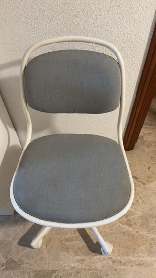 Silla de escritorio de Ikea con un diseño moderno y funcional. - Asiento y respaldo acolchados para mayor comodidad. - Base con ruedas para facilitar el movimiento. - Altura ajustable para adaptarse a diferentes mesas.