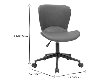 Silla de oficina con un diseño moderno y funcional. - Tapizado en tela gris. - Base de plástico con ruedas. - Reposabrazos negros.