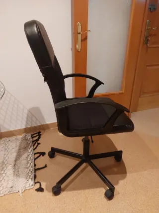 Silla de escritorio de IKEA, con un diseño clásico y funcional. - Tapicería desgastada en piel sintética. - Base con ruedas para fácil movilidad. - Respaldo alto para mayor comodidad. Precio original: 150€