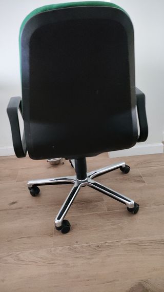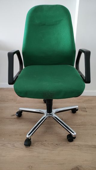 Se vende silla de escritorio giratoria. Es de color verde y negro, con ruedas. - Estructura resistente. - Tapizado en tela. - Cómoda y práctica. Elevación para ajustar altura mediante palanca, con reposabrazos. Hay que limpiar l tapicería, pero no está rozada. Dispongo de dos unidades iguales.
