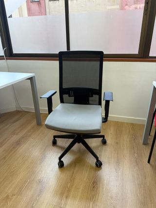 Silla de oficina con un diseño moderno y cómodo, en perfecto estado. - Respaldo y asiento tapizados en tela. - Base de plástico con ruedas. - Brazos ergonómicos.