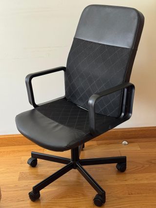 Silla de oficina Ikea giratoria con un diseño moderno y cómodo. - Tapicería en polipiel y tela. - Base metálica con ruedas. - Reposabrazos integrados. - Perfecto estado, está como nueva