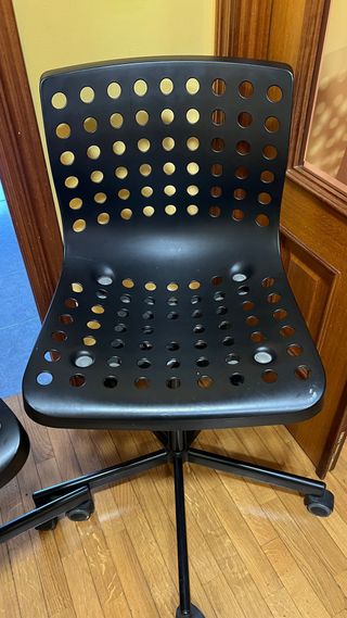 2 Sillas de oficina giratoria con un diseño moderno y funcional. - 15€ precio conjunto por las 2 sillas. - Asiento y respaldo perforados para mayor ventilación. - Base con ruedas para facilitar el movimiento. - Altura ajustable.