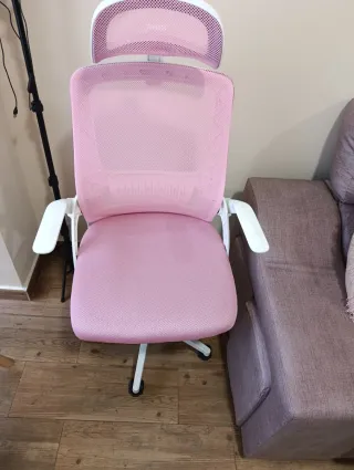 Silla de escritorio con un diseño moderno y cómodo, ideal para largas jornadas de trabajo o estudio. Su estructura combina a la perfección el color rosa del asiento y respaldo con detalles en blanco. - Respaldo ajustable para mayor confort. - Reposabrazos ergonómicos. - Base con ruedas para fácil movilidad.