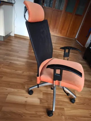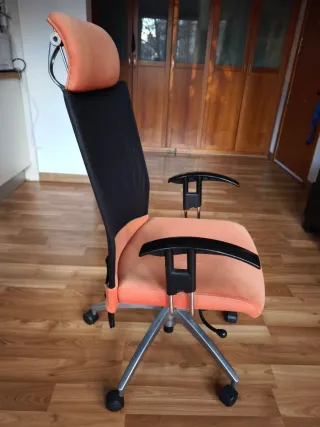 Silla de oficina cómoda,con diseño ergonómico y transpirable. Estructura robusta de metal. -Es reclinable y se ajusta también la altura del asiento. - Respaldo alto con soporte acolchado y ajustable para la cabeza. - Asiento acolchado color salmón - Reposabrazos. - Base con ruedas para fácil movilidad. Vendo por no usar, esta en perdecto estado.
