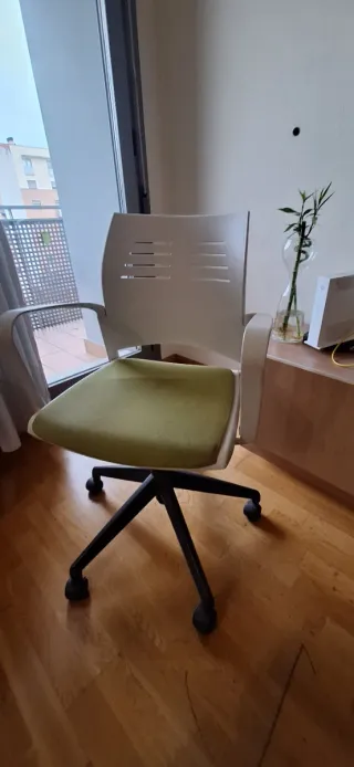 Silla verde de escritorio, no tiene ruedas. Esta en buen estado, usada y bien conservada.