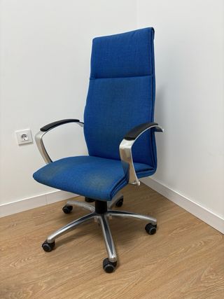 Silla de oficina ergonómica en muy buen estado. Diseño cómodo con respaldo alto acolchado, ideal para trabajar durante muchas horas. Dispone de: • Altura regulable • Base metálica con ruedas • Reposabrazos • Tapizado azul resistente • Giro 360° Es una silla robusta y cómoda, perfecta para oficina, despacho, clínica o teletrabajo. Se vende por cambio de mobiliario.