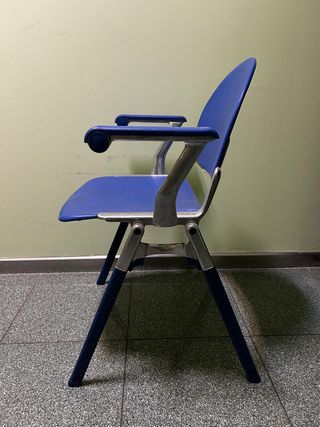 Silla de oficina SOKOA con asiento y respaldo en plástico azul y estructura metálica. - Diseño moderno. - Brazos con acabado cromado. - Patas de metal. - Posibilidad de comprar hasta 4 unidades. Vamos a cambiar el mobiliario de la oficina y estamos vendiendo el actual.