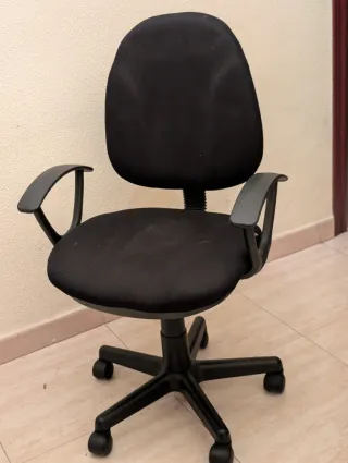 Silla de escritorio cómoda y funcional. - Asiento y respaldo tapizados en tela. - Base de plástico con ruedas. - Reposabrazos ergonómicos. - En muy buen estado, la vendo por falta de uso y porque se me queda pequeña para mi escritorio.