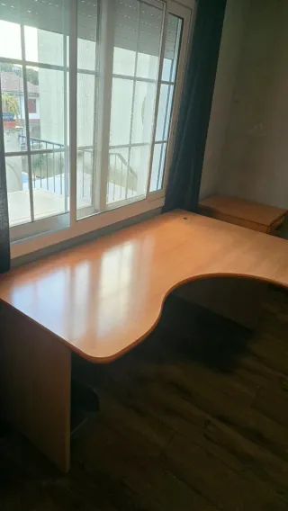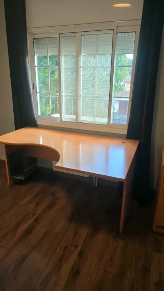 Vendo lote de muebles por mudanza. Ideal para amueblar piso/oficina con todo en un solo anuncio. Se puede vender separado (prioridad a lote). Incluye: Escritorio curvo: 160 x 100 x 70 cm añadido/módulo con cajones: 60 x 50 cm Mesa de comedor extensible: 90 x 90 cm (se extiende) 4 sillas (necesitan tapizado, estructura OK) Estantería: 180 x 45 cm Cómoda: 180 x 40 cm Buen estado. Recogida en Pallaresos. Posibilidad de ayudar a desmontar/transportar según el caso. Precio por el lote: 200 (negociable si recogida rápida, se pueden vender por separado).