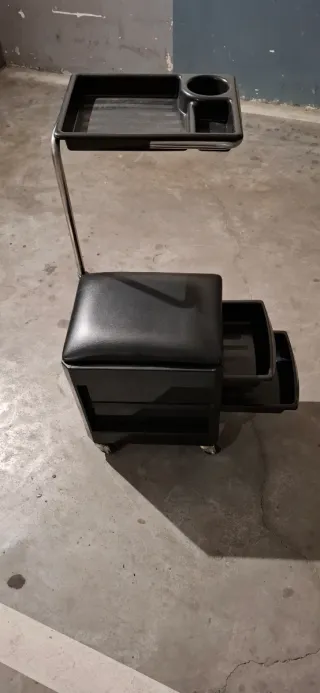 Carrito auxiliar para peluquería o estética, con asiento y bandeja superior. - Bandeja superior con compartimentos para herramientas. - Asiento acolchado. - Cajones extraíbles para organización. - Ruedas para fácil movilidad.