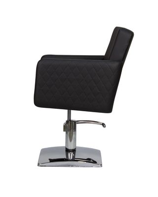 Silla de corte para peluquería. Elevación hidráulica, soporte peso hasta 200 kg. Tapizado negro mate, laterales en rombo termo sellado. Base puede ser cuadrada o redonda.