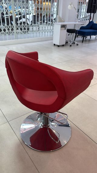 Silla de peluquería con un diseño moderno y elegante. Solo se vende una. - Tapicería en piel sintética. - Base y estructura metálica cromada. - Altura regulable.