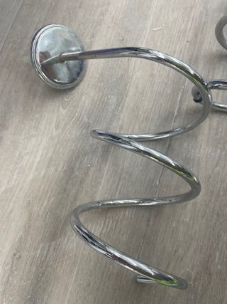 Se venden dos soporte para secador de metal. Son de color plateado y tienen un diseño en espiral. Están en buen estado. su precio es de 8 euros cada uno. - Diseño elegante y moderno. - Fabricados en metal resistente. - Perfectos para cualquier peluquería o para uso domésticos.