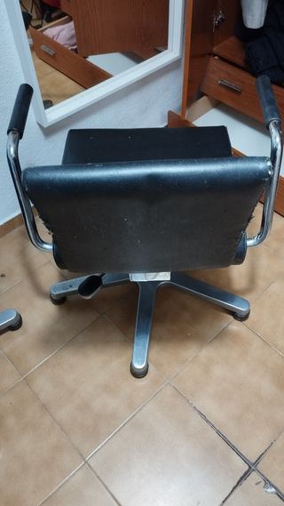 Pareja de sillas de oficina o peluquería. Son de color negro, con estructura metálica y tapizado de piel sintética. Presentan un estilo clásico y se encuentran en buen estado, aunque con algunas señales de uso. - Ideales para sala de espera o negocio. - Diseño retro elegante. - Estructura resistente.
