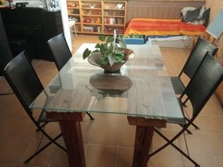 se vende mesa de cristal, se hace más grande. Con 4 sillas de piel sintetica, la mesa tiene una ralladita en el marco pero lo demás esta perfecta, las sillas están perfectas.