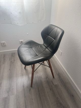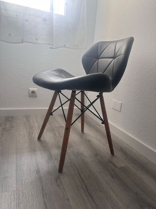 Preciosa silla de diseño, estilo Eames, en color negro. Es perfecta para darle un toque moderno a cualquier espacio. - Asiento de piel sintética. - Patas de madera de haya. - Diseño elegante y cómodo.