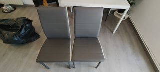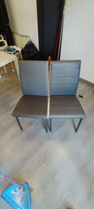 Se venden dos sillas de comedor. Son de color gris y blanco, con estructura metálica y asiento de piel sintética. Están en buen estado. - Diseño elegante y moderno. - Perfectas para cualquier comedor. en la última foto se ve una un poco más trotada, pero están muy bien.