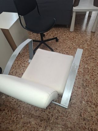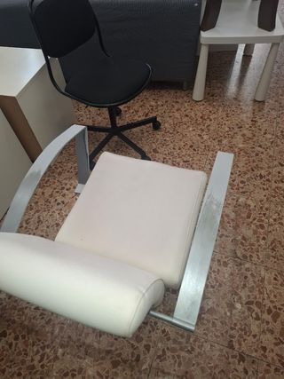 Preciosa silla de oficina o recepción, con estructura metálica plateada y asiento de piel sintética blanca. Es cómoda y elegante. - Ideal para oficina o sala de espera. - Diseño moderno y minimalista. - Se encuentra en buen estado, aunque presenta algunas marcas de uso en la estructura metálica.
