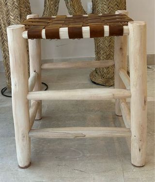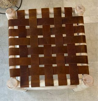 Taburete artesanal con estructura de madera y asiento tejido en piel. - Diseño rústico y único. - Combinación de colores beige y marrón.