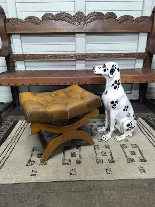 Instagram janoradeco. Reposa pies de piel. Vintage. Estructura de madera. Medidas 53 x 40 y 40 de alto.