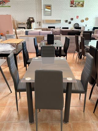 Mesa de 110*70cm con patas metálicas y tablero de cristal, Patas en PVC con cantoneras anti-rayado, mas 4 sillas. Sillas fabricadas en estructura metálica Asiento y respaldo en poli-piel sintético acolchado. Color: Negro, Blanco, gris y marrón ENTREGAS INMEDIATAS SE ENTREGA DESMONTADO *Pago en efectivo al momento de la entrega! PARA MÁS INFORMACIÓN: 673.033.132 (Tamara)