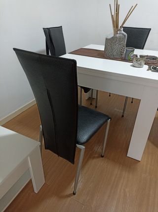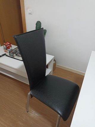 Se venden 4 sillas de comedor. Las 4 por 70€ Son negras y están fabricadas con piel sintética y patas de metal. Se encuentran en buen estado, aunque presentan polvo de estar en un trastero. - Diseño elegante y moderno. - Perfectas para cualquier comedor.