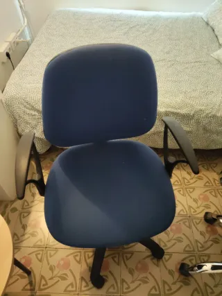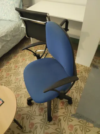 Dami un oferta - por ambos o uno de las sillas Conjunto de dos sillas de oficina, una azul y otra gris. - Silla azul con estructura metálica y asiento de tela. - la silla izquerida es de IKEA - €70 nuevo - la silla derecha es de El Cortes Ingles €200 nuevo - Silla gris con respaldo de malla y asiento de tela. - Ambas sillas tienen base de plástico con ruedas.